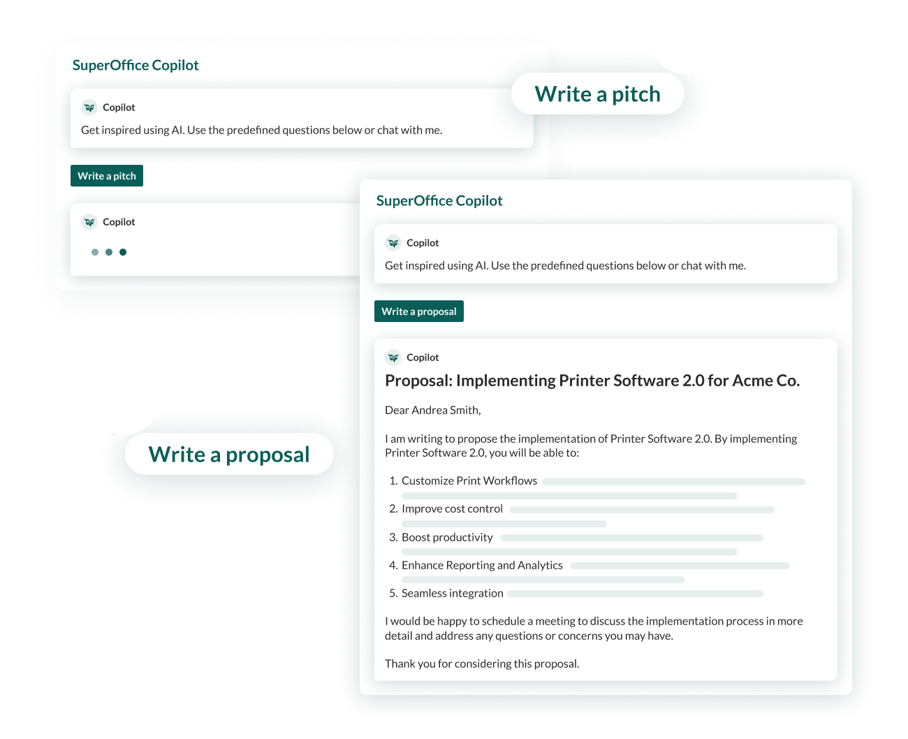- Kickstart your writing instantly with SuperOffice Copilot, mixing your own ideas with fresh perspectives
