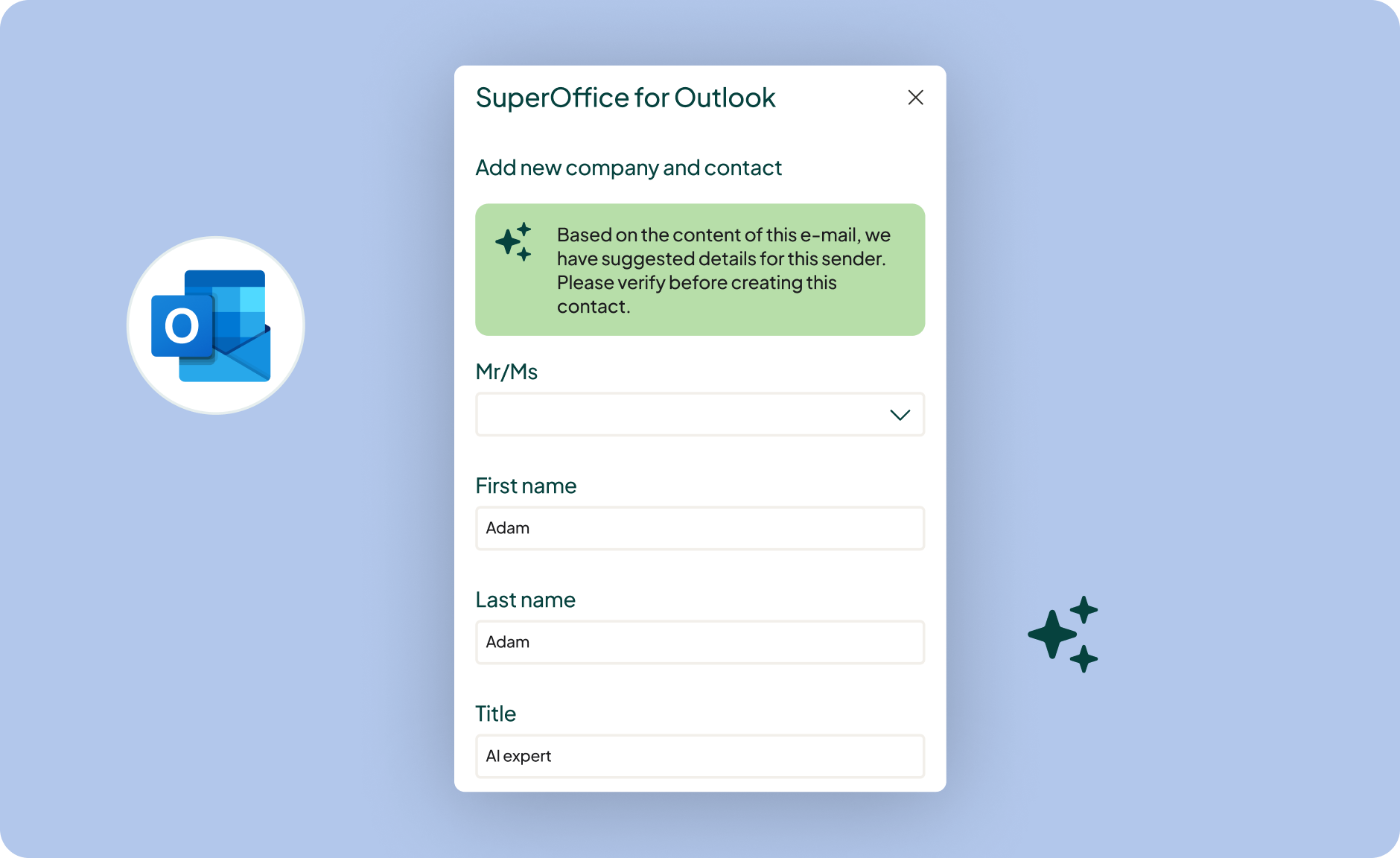 Save time with auto-fill suggestions for your contacts on SuperOffice for Outlook. SuperOffice Copilot extracts information available from your CRM to suggest field inputs for your new contacts.