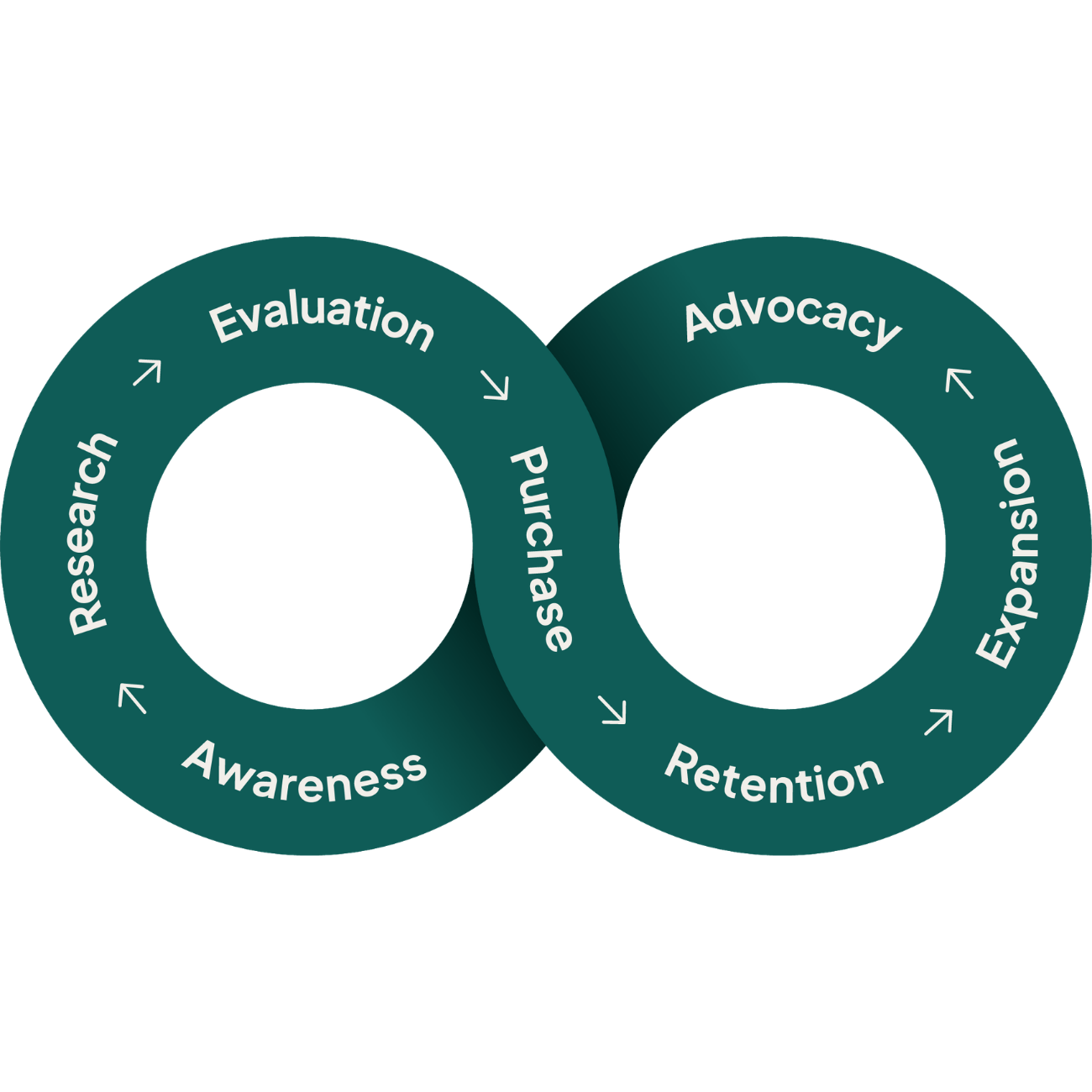 SuperOffice CRM is built around the Relationship Loop, focusing on long-term growth through awareness, research, evaluation, purchase, retention, expansion, and advocacy.