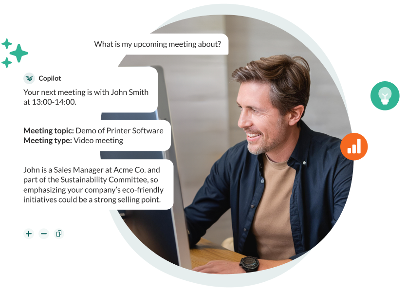 By ensuring data quality and context relevance within SuperOffice CRM, SuperOffice Copilot is your AI-powered assistant and helper for your busy workday, helping you arrive at data-driven decisions – quickly.