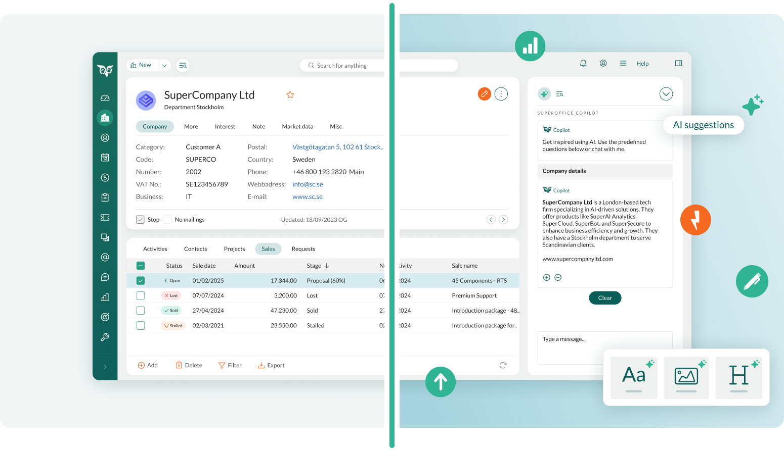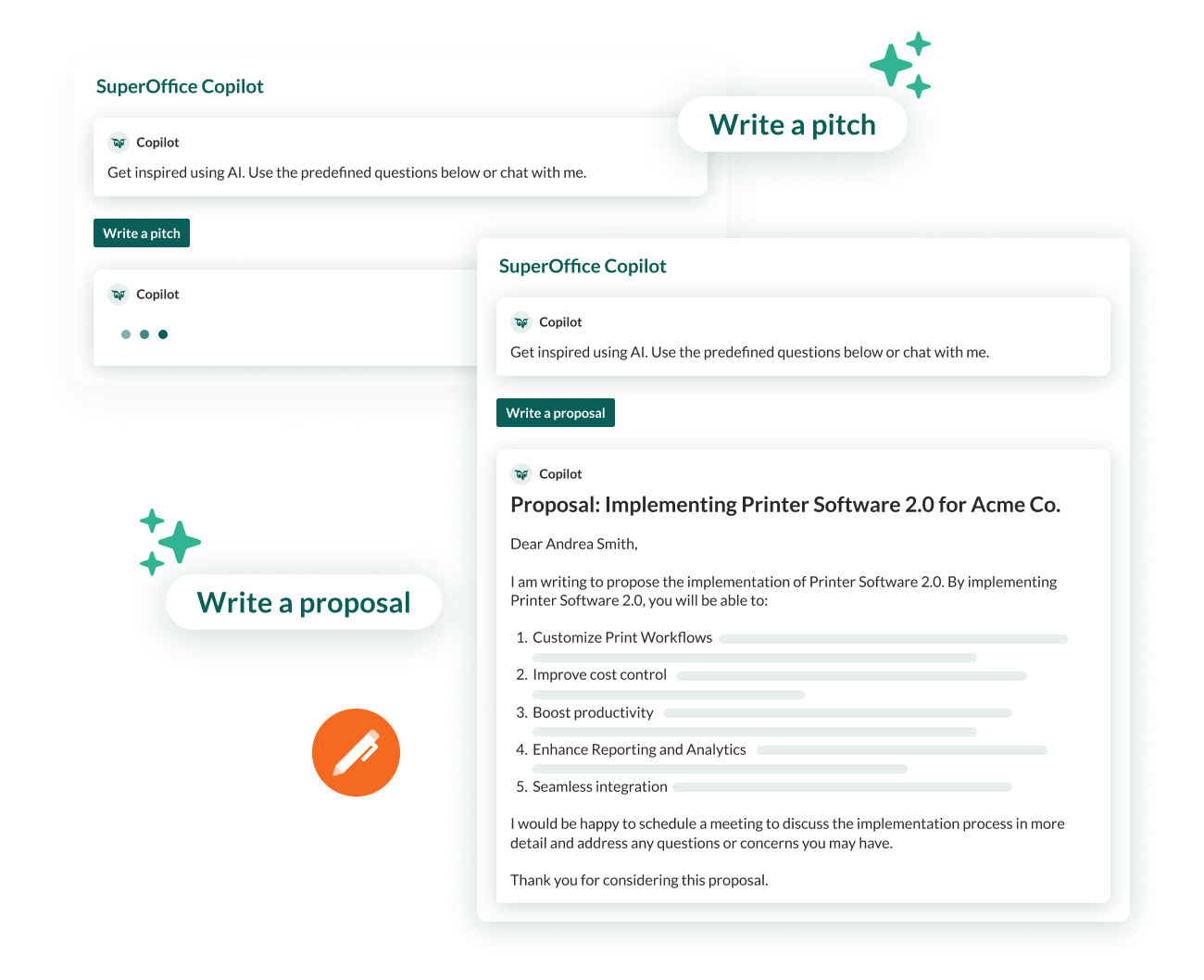 - Kickstart your writing instantly with SuperOffice Copilot, mixing your own ideas with fresh perspectives