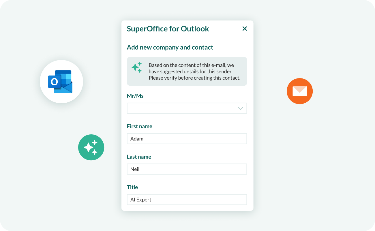 Save time with auto-fill suggestions for your contacts on SuperOffice for Outlook. SuperOffice Copilot extracts information available from your CRM to suggest field inputs for your new contacts.