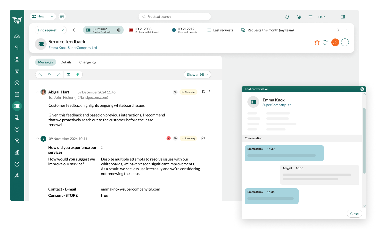 - Hallinnoi kaikkia keskusteluja suoraan palvelupyyntöjonosta ja vastaa chat-viesteihin välittömästi