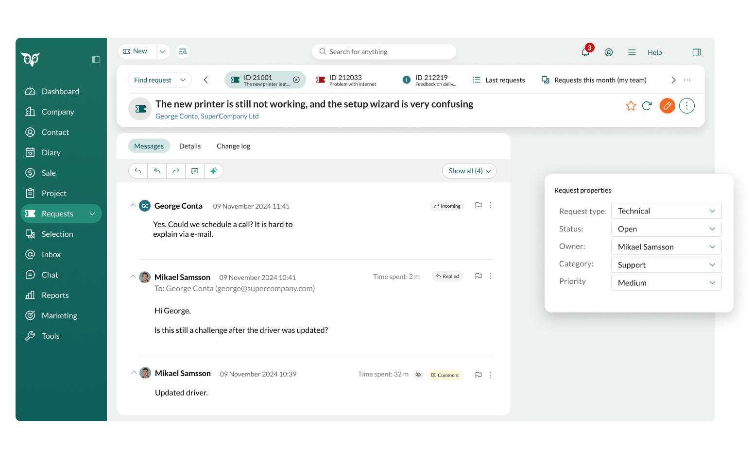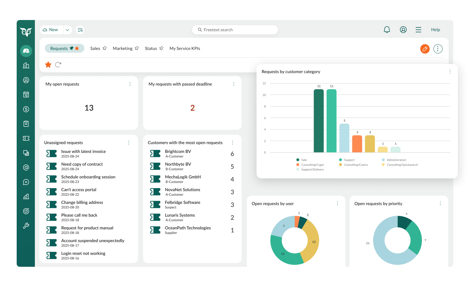Nosta palvelutasoasi ja käsittele kaikki pyynnöt samassa järjestelmässä, valmiiksi lajiteltuina jonoihin. SuperOffice prosessoit sekä ulkoiset että sisäiset palvelupyynnöt (IT, markkinointi, HR, sijoittajat).