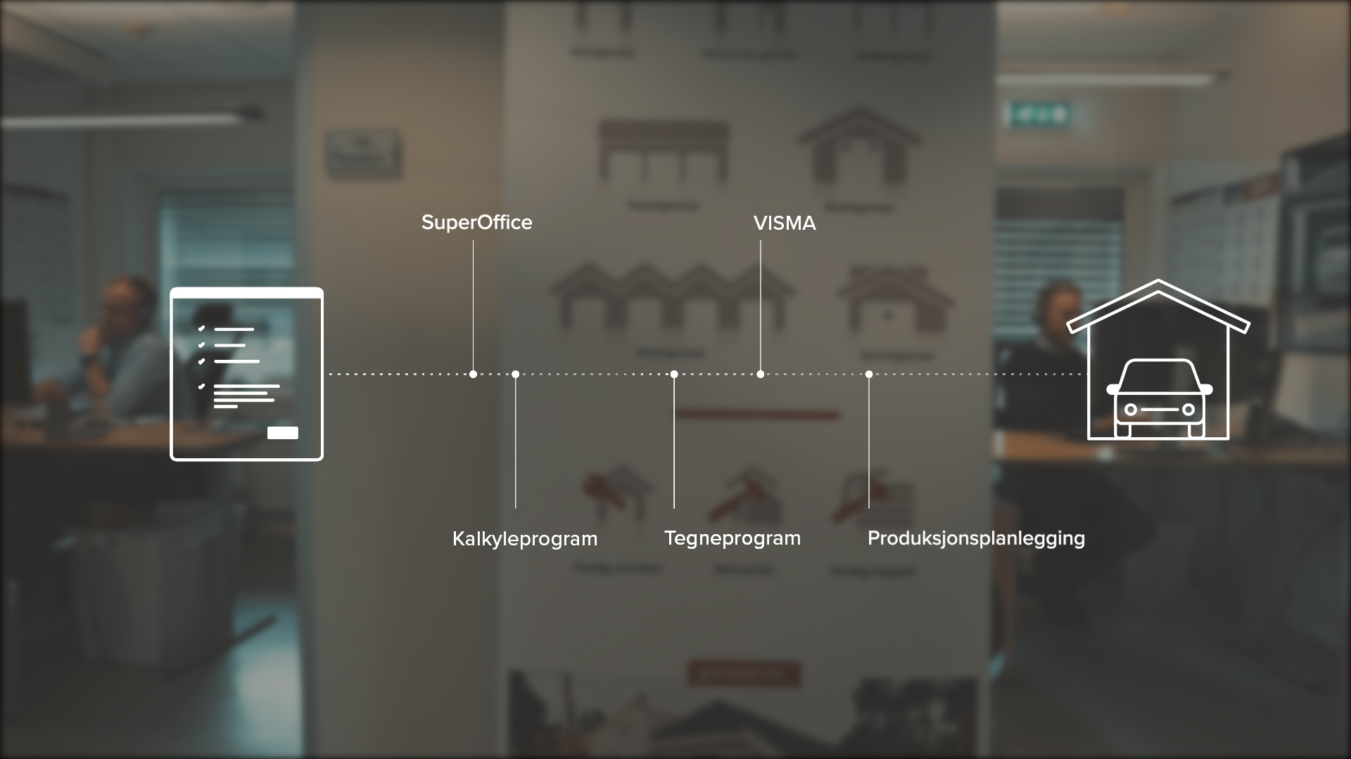- It often starts with customers Googling 'garage.' They land on our website, where they fill out information in web forms. That information follows the garage throughout the process: from the sales team to the calculation program, the offer, the garage drawings, order reception, the warehouse, then production, and finally to the completed building kit or the assembled garage.