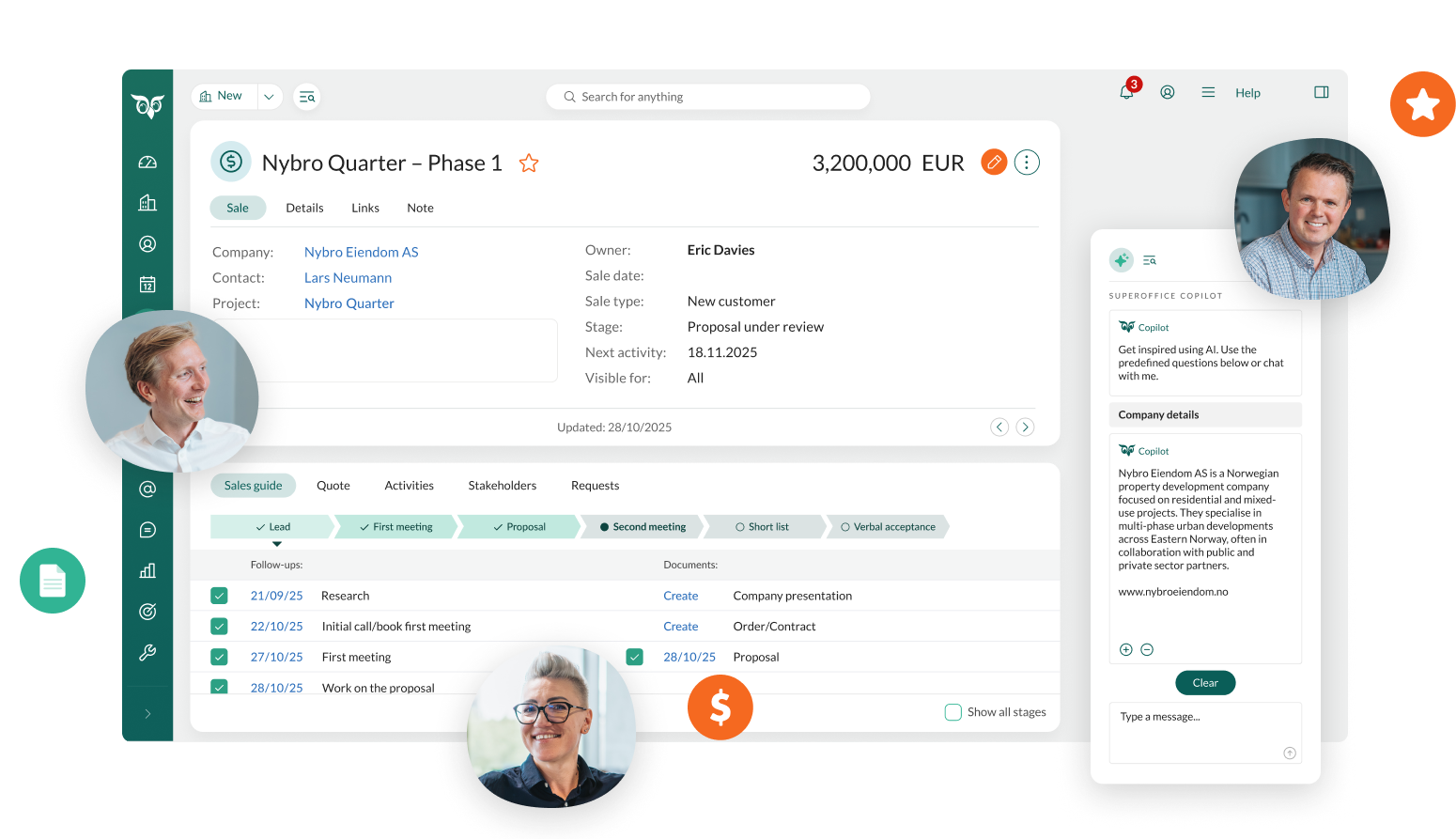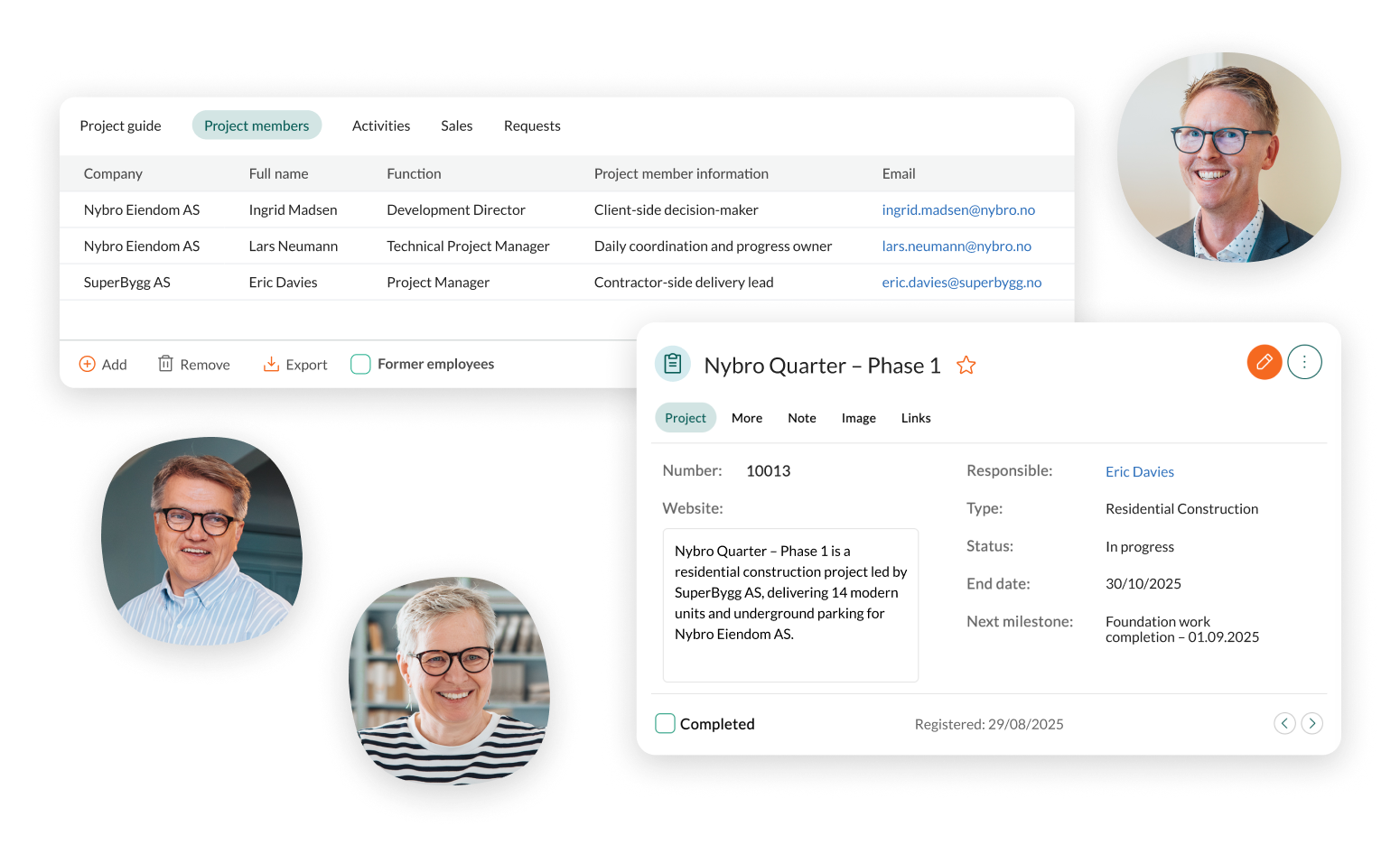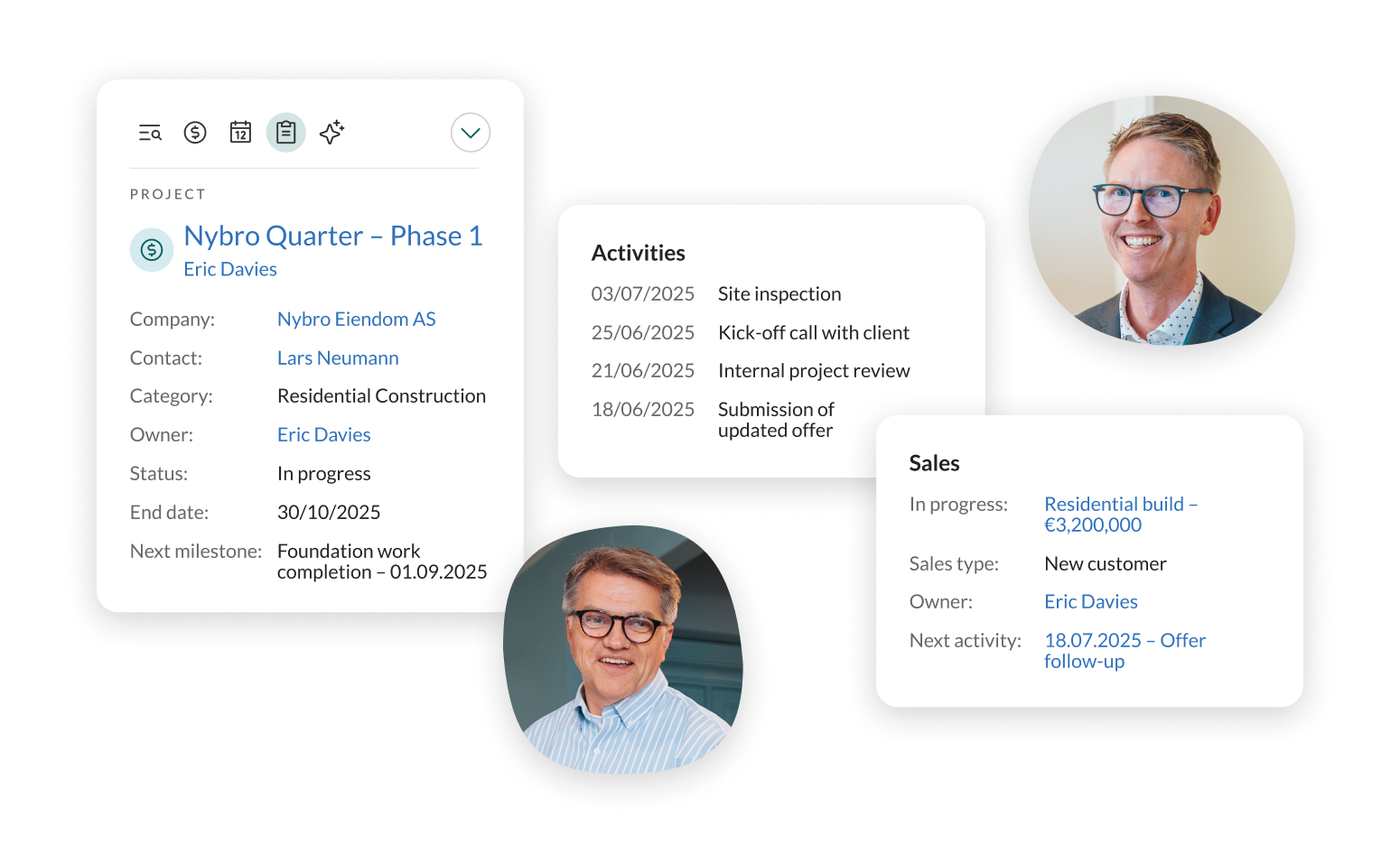 SuperOffice adapts to how you work - configure projects for individual buildings, geographic areas, tender processes, or multi-phase developments. Whether you're in timber construction, building technology, sustainability construction, or traditional building - customize workflows to match your specific process.