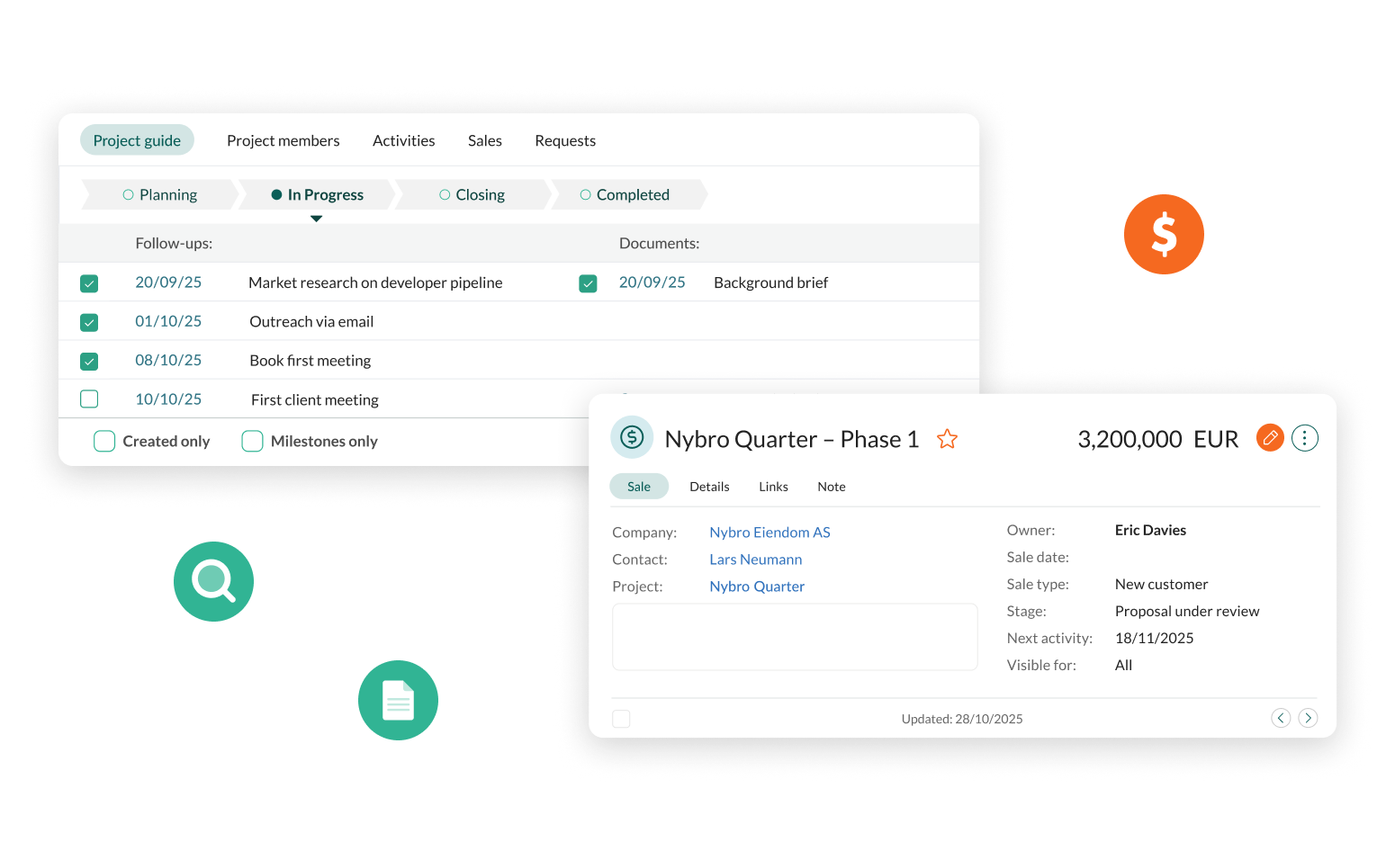 Get comprehensive oversight of all project activities, documentation, and stakeholders. Track meetings with contractors, site inspections, supplier communications, technical drawings, certificates, and product specifications - all connected to your projects and customer relationships.